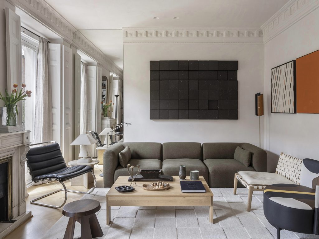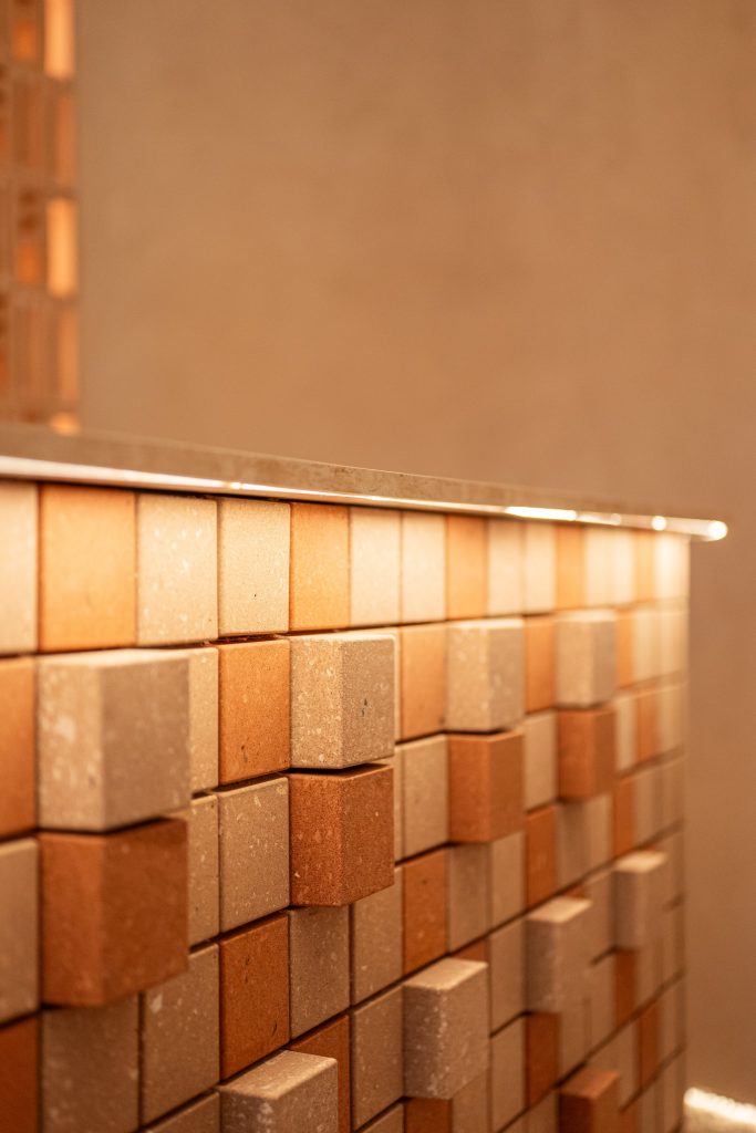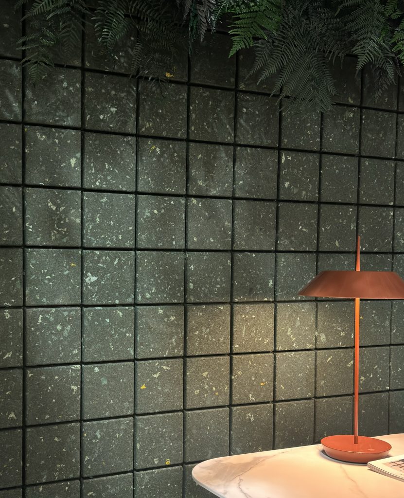 Presented in 40 × 80 cm panels, Manhattan is handcrafted in Spain and composed of 90% recycled materials. It combines textile waste and recycled cork to create a decorative and acoustic solution for walls and ceilings.
